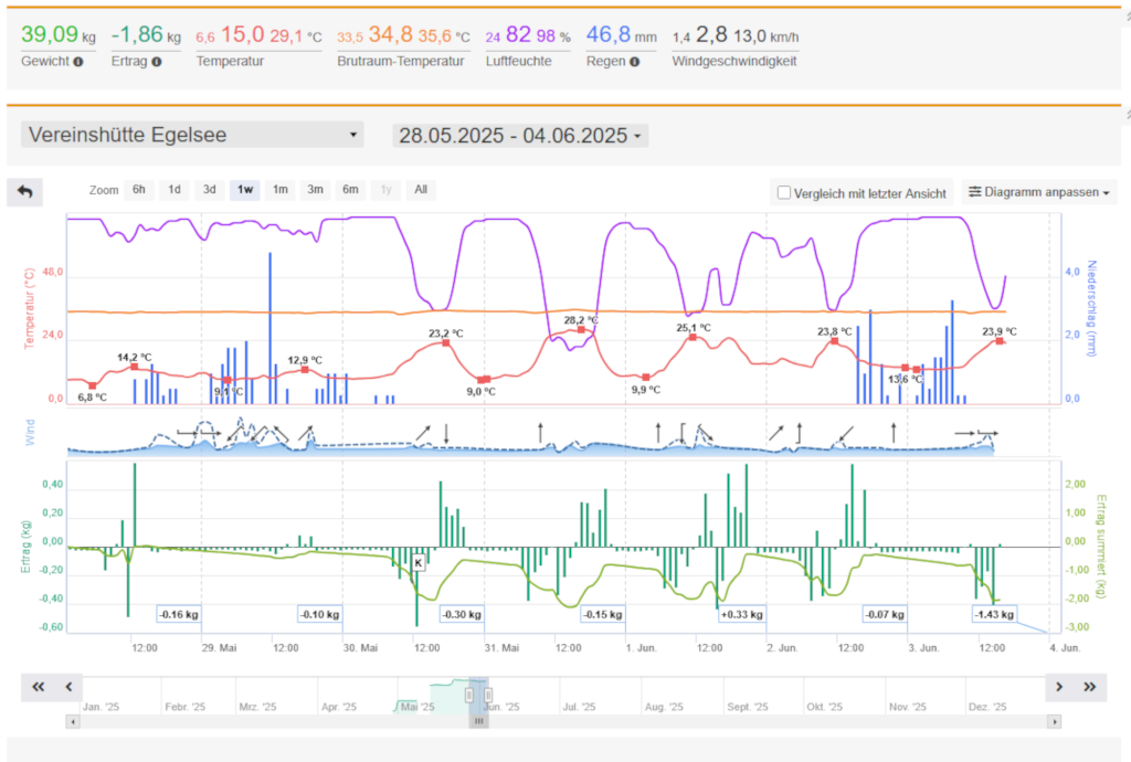 Messdaten unserer Stockwaage und unserer Wetterstation am Egelsee