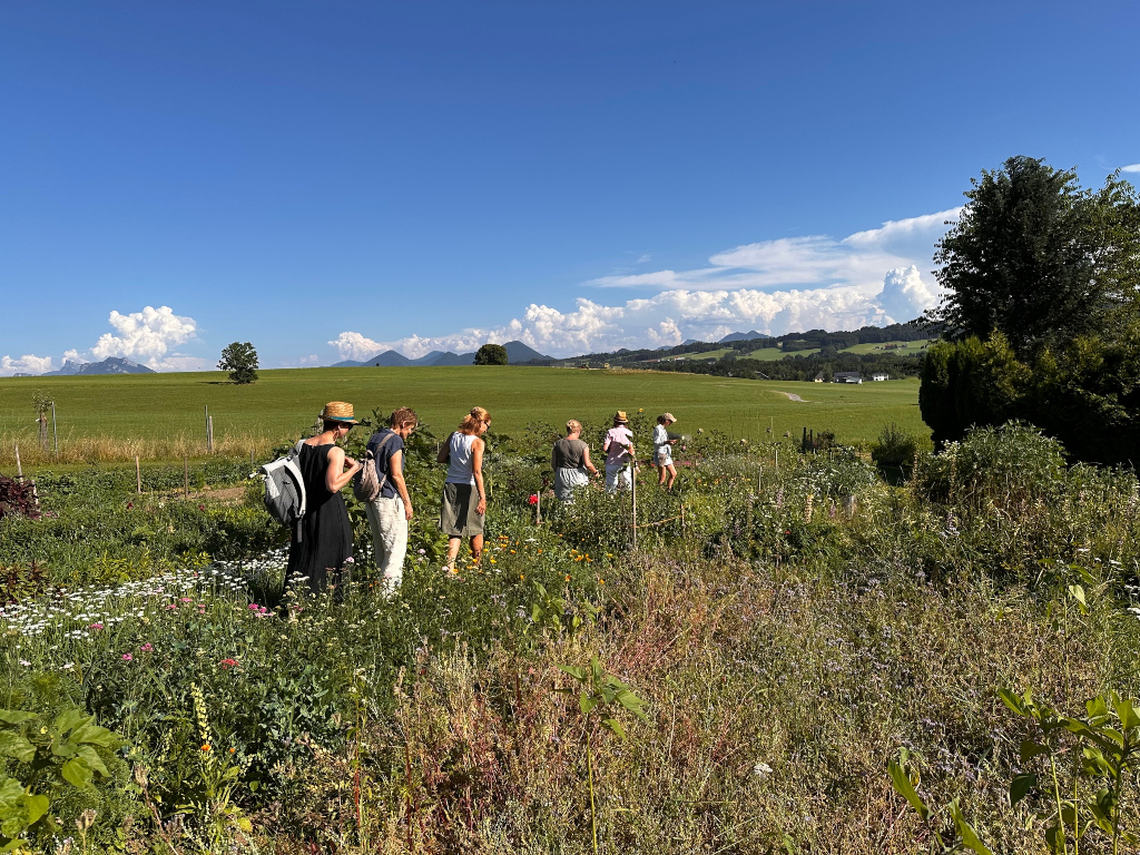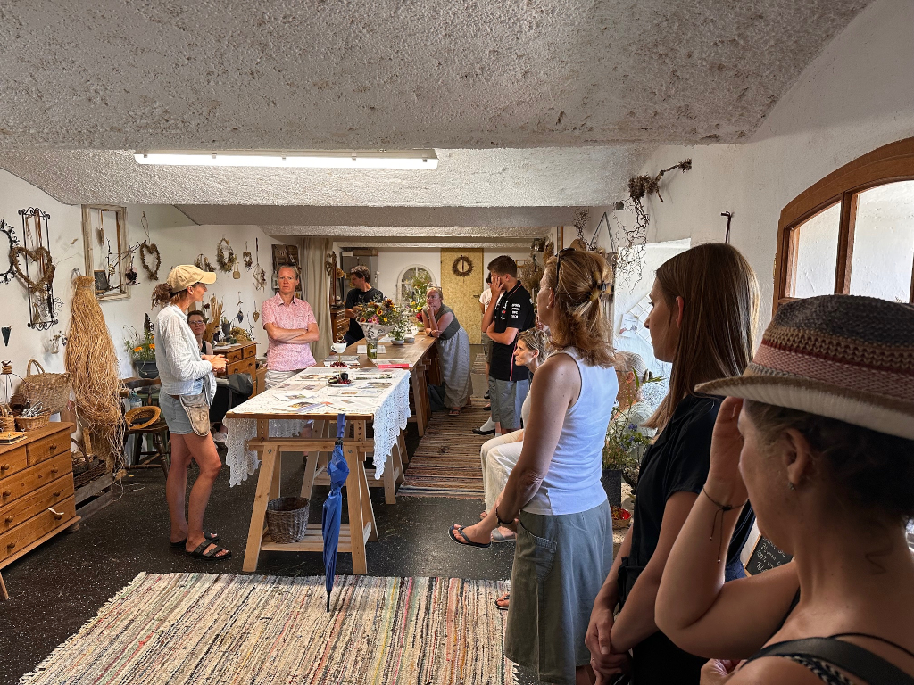 Ein Highlight des Besuchs war der Rundgang über das Hofgelände: Brigitte zeigte uns die mit Schlacken verzierte Hausfassade – gestaltet von Bautrupps aus Italien und Serbien, welche die Fassade auch unterschiedlich ausgestalteten – und erzählte vom Hausbrunnen, der dank eines Brunnenbauers aus dem Lungau heute Trinkwasser liefert. Auch die Geschichte des Schimmels in den Mauern und der schwierigen Renovierung mit atmungsaktiven Materialien bleibt uns in Erinnerung. Danach gingen wir über die Blumenfelder und Brigitte erzählte darüber, wie diese abwechselnd bepflanzt werden.