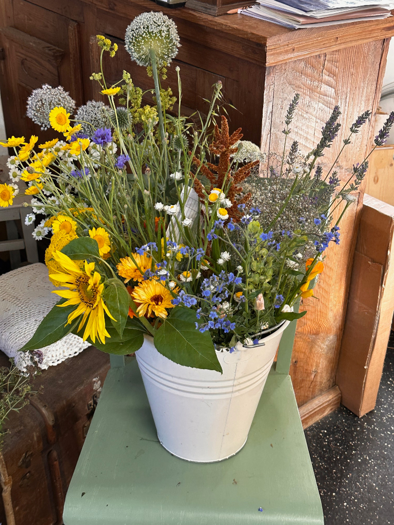 An diesem heißen Tag begrüßte uns Brigitte im angenehm kühlen ehemaligen Kuhstall, in dem sich heute ihr Verkaufsraum mit selbst gebundenen Sträußen, Töpferwaren und vielen anderen liebevollen Details befindet.