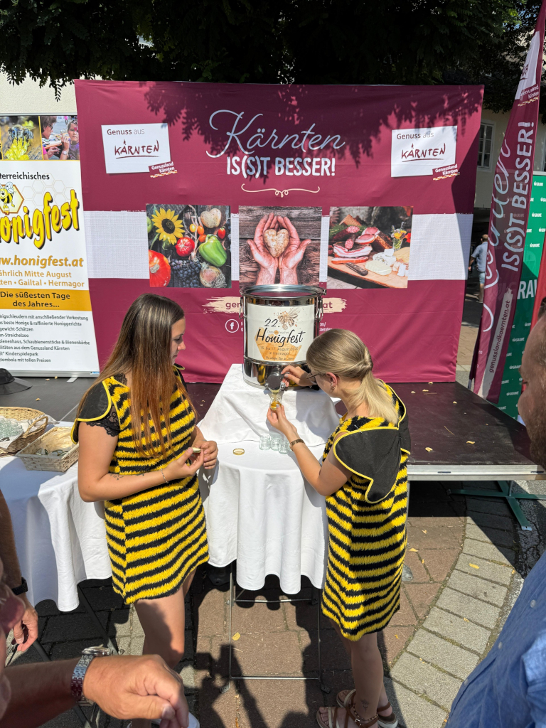 Vom 15. bis 17. August 2025 stand Hermagor ganz im Zeichen der Bienen: Beim bereits 22. Honigfest summte und brummte es an jeder Ecke. Zahlreiche Imkervereine präsentierten Schaukästen mit lebenden Bienen und es bestand sogar die Möglichkeit, Drohnen hautnah zu erleben und zu streicheln. Besonders faszinierend war das Live-Honigschleudern: Durch eine gläserne Schleuder konnte man genau beobachten, wie frisch entdeckelte Waben ihren goldenen Schatz freigaben.
